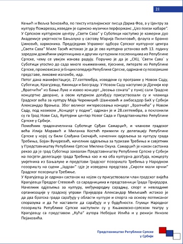 Србија“. У Народном музеју у Крушевцу отворена је изложба „Змијањски вез Кењић и Вељка Ђоковића, по тексту италијанског писца Дариа Фоа, а у Центру за
